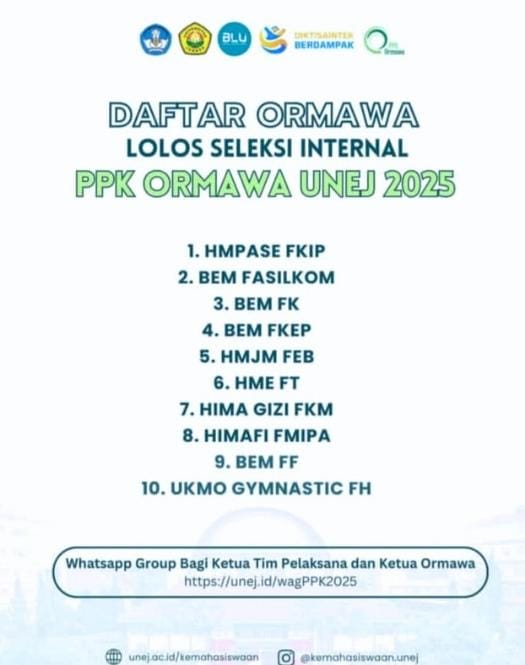Kami mengucapkan selamat dan apresiasi setinggi-tingginya kepada Tim PPK ORMAWA HIMAFI 2025 atas lolosnya seleksi internal PPK ORMAWA UNEJ 2025.