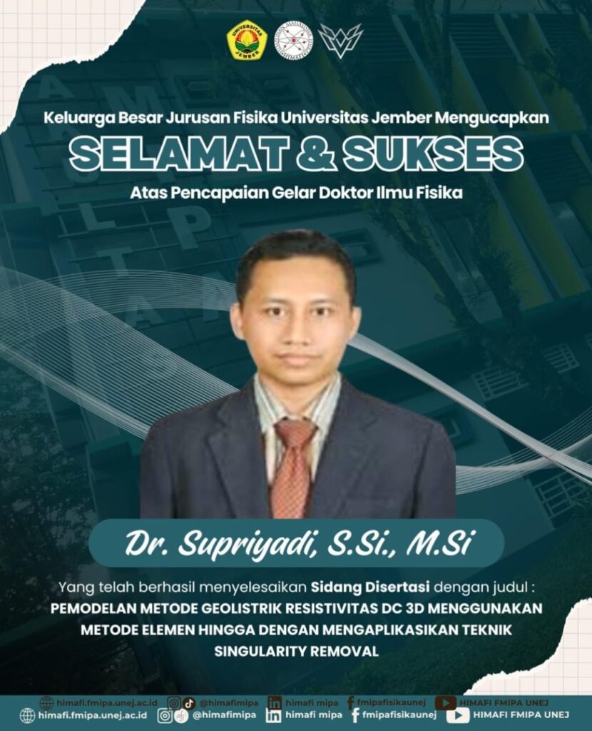 Keluarga Besar Jurusan Fisika Universitas Jember mengucapkan Selamat kepada Dr. Supriyadi, S.Si., M.Si