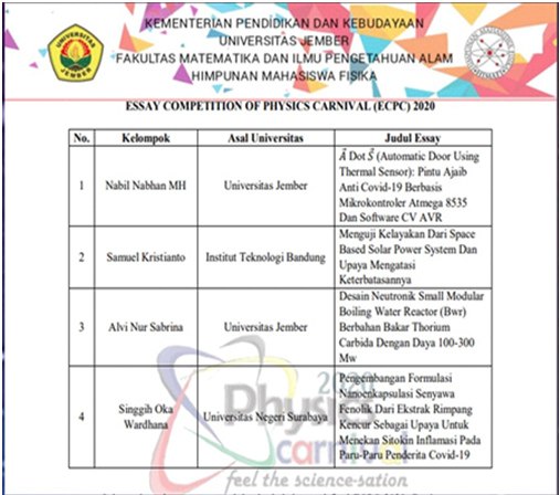 Himpunan Mahasiswa Jurusan Fisika (HIMAFI) Fakultas MIPA Universitas Jember mengadakan acara “Physics Carnival” yang diikuti oleh siswa jenjang SMP, SMA dan perguruan tinggi. Essay adalah lomba untuk jenjang perguruan tinggi yang rangkaian acaranya meliputi Essay dan presentasi essay-nya. Essay adalah karangan pendek berdasarkan cara pandang seseorang dalam menyikapi suatu masalah.Essay yang merupakan karya sastra dalam bentuk tulisan ini dibuat dalam jumlah kalimat yang singkat atau pendek. Oleh karena itu, isi dari essay berupa kajian yang singkat, padat dan jelas. Gaya bahasa yang digunakan pun selalu khas sesuai dengan karakter dari penulis.Diharapkan dengan adanya lomba essay pada perguruan tinggi mahasiswa dapat lebih inovative dan mampu melatih kemampuan dalam menulis Essay.