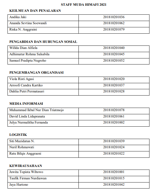 Akhirnya hari yang ditunggu tunggu datang yaitu Pengumuman Staff Muda HIMAFI 2021!!! Kami dari HIMAFI mengucapkan selamat atas terpilihnya para Staff Muda HIMAFI 2021 dan selamat berproses di HIMAFI selama 1 periode kedepan. Dan bagi kalian yang belum berkesempatan bergabung dengan HIMAFI keep spirit and never give up!