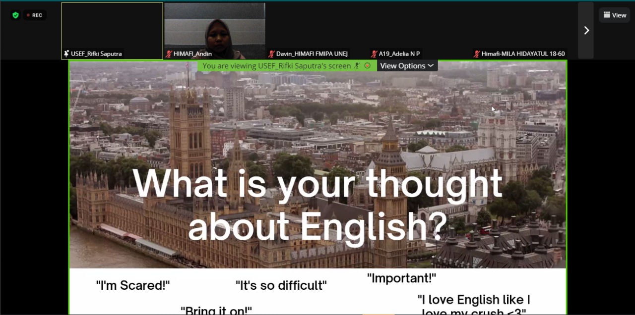 English Day is a program in HIMAFI which will provide facilities to upgrade your english skill. English Day begins with “English Day Socialization”on Saturday 24 April 2021. The English Day socialization program was given material by Rifky Saputra as USEF President 2021. HIMAFI, especially the Scientific and Reasoning division, gave an introduction to the English Day program for Physics Students.