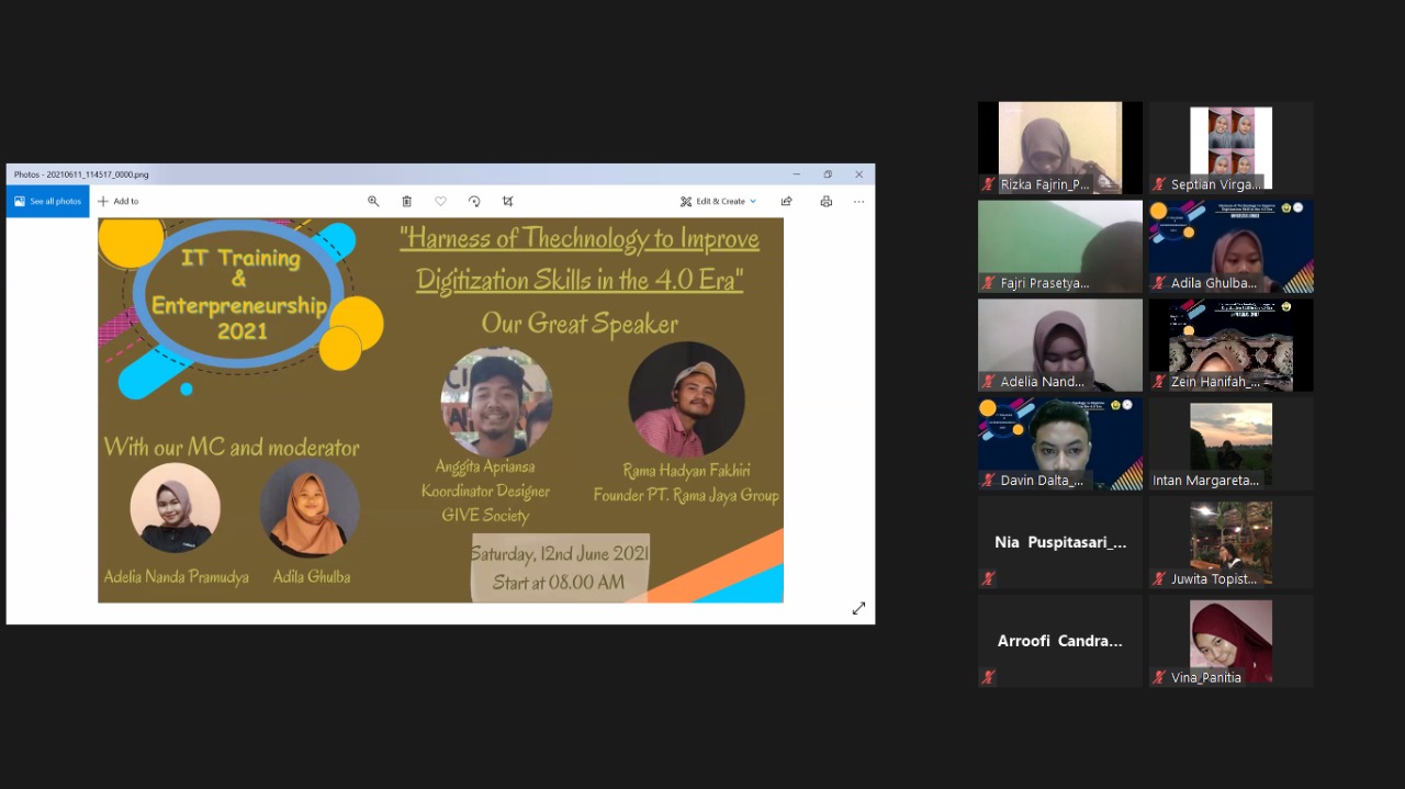 Untuk mendukung perkembangan internet dan teknologi khususnya didunia design graphics dan bisnis, HIMAFI (Himpunan Mahasiswa Fisika) mengadakan workshop tentang design dan entrepreneurship yang disebut dengan event IT Training and Entrepreneurship. Event ini bertujuan untuk mengembangkan softskill mahasiswa FMIPA khususnya fisika dibidang non akademik yaitu bidang design graphics dan entrepreneur. IT Training and Entrepreneurship kali ini bertemakan Harness of Technology to Improve Digitization Skills in the 4.0 Era. Event ini dilaksanakan pada tanggal 12 Juni 2021 dan dimulai dari pukul 08.00 WIB.