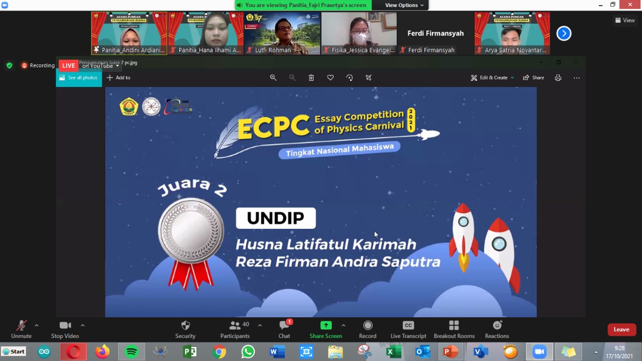 Selain itu di akhir acara ada pengumuman pemenang untuk ECPC dan PHYSTON 2021 secara online dan dilakukan penyerahan secara simbolis oleh Ketua Jurusan Fisika Bapak Dr. Lutfi Rohman S.Si., M.Si. Pasti dari kalian penasaran kan siapa saja yang menjadi pemenangnya ??
