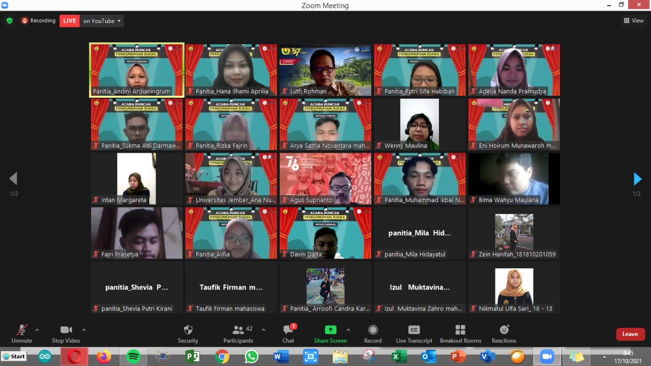 Akhirnya yang ditunggu-tunggu telah tiba nih, yups!! Dari sekian banyak tahapan seleksi, Akhirnya telah ditentukan pemenang dari lomba PHYSTON Physics Carnival dan ECPC (Essay Competition Physics Carnival) 2021. Sebelumnya Physics Carnival ini adalah suatu ajang perlombaan yang diadakan oleh HIMAFI FMIPA Universitas Jember guna untuk melatih skill di bidang mipa dan essay. Tahap Final Physics Carnival diadakan pada Hari Sabtu 16 Oktober 2021 dan acara puncak pada Minggu 17 Oktober 2021. Acara puncak Physics Carnival dilakukan secara online dan menampilkan band dari UKMS TITIK FMIPA serta penjelasan beberapa club di jurusan Fisika.