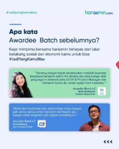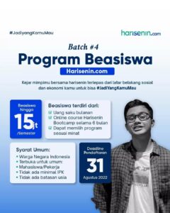 Pas banget nih ada Beasiswa dari Harisenin.com buat kamu yang pengen banget berkarir di Digital Marketing, Auditor & Financial Analyst, Human Resources, Graphic & Motion Design, UI/UX Designer & Product Manager, Full Stack Web Developer🧐