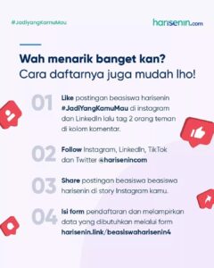 Segera daftarin langsung diri kamu untuk dapetin beasiswa nya dari harisenincom dan baca dulu syarat dan ketentuan nya yah karena program ini kuotanya TERBATAS loh. Yuk wujudkan #jadiyangkamumau bersama harisenin