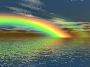 7. Pembentukan Pelangi: Akhirnya, cahaya yang keluar dari tetesan air membentuk pelangi di langit. Pelangi terlihat sebagai lingkaran penuh atau setengah lingkaran dengan warna-warna yang terpisah seperti merah, oranye, kuning, hijau, biru, nila, dan ungu.